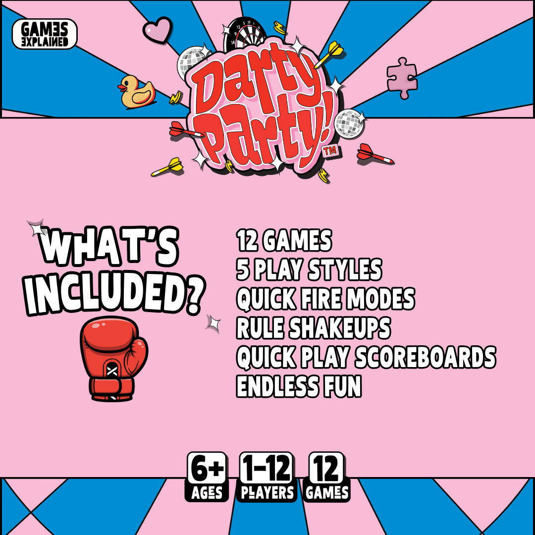 DARTY PARTY IS THE INSTANT GAMES NIGHT THAT TURNS YOUR DARTBOARD INTO THE HER. NO SETUP. NO STRESS. EASY PLAY.